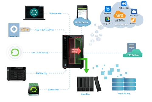 NAS ของ ASUSTOR มีตัวเลือกในการ Backup มากกว่า 12 แบบ และยังมีการเชื่อมต่อกับผู้ให้บริการ Cloud สาธารณะหลากหลายแห่ง เช่น Amazon S3, Dropbox, Google Drive, OneDrive ฺBackup Plan ของ ASUSTOR สำหรับ Windows และ Time Machine สำหรับ MacOS ทำให้การ Backup นั้นเป็นเรื่องง่ายดายสำหรับ Desktop และ Notebook ในขณะที่ Harddrive MyArchive จะทำหน้าที่เป็นพื้นที่เก็บข้อมูลระยะยาว. Btrfs ก็รองรับและเมื่อใช้งานกับ Snapshot Center จะสามารถสร้าง Snapshot ให้กับข้อมูลของคุณ เพื่อป้องกันการแก้ไขโดยที่ไม่ได้ตั้งใจ กู้ไฟล์เวอร์ชั่นเก่ากลับมาได้อย่างง่ายๆ ด้วย Snapshot Center