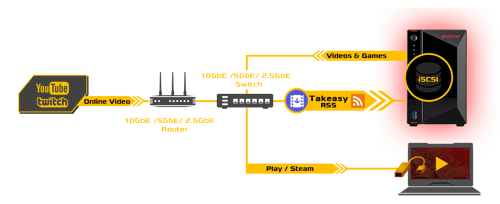 YouTube และ Twitch เป็นแพลตฟอร์มคลาวด์ที่ไม่ค่อยเชื่อถือได้กับการจัดเก็บในระยะยาวของเนื้อหาและวิดีโออาจถูกลบโดยไม่ต้องแจ้งให้ทราบล่วงหน้า สำหรับที่ ASUSTOR ให้ Takeasy, app ที่ดาวน์โหลดวิดีโอจาก YouTube และ Twitch เพื่อการจัดเก็บโดยอัตโนมัติและสามารถดาวน์โหลดเนื้อหาสาธารณะทั้งหมดออกจากช่องที่เฉพาะเจาะจง