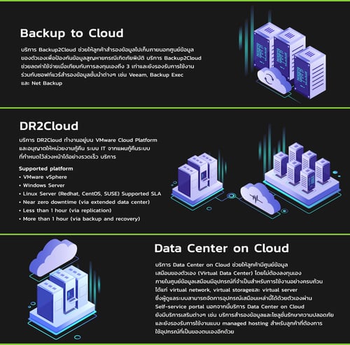 | เทียบกับผู้ให้บริการต่างประเทศ • ความเร็วในการรับส่งข้อมูล (ระบบติดตั้งอยู่ในประเทศ) • คลาวด์ต่างประเทศคิดค่าใช้จ่ายในการนำข้อมูลออก | เทียบกับผู้ให้บริการในประเทศ • มีบริการเสริมอื่นๆที่นอกเหนือจาก server บน cloud เช่น backup to cloud และ disaster recovery to cloud • ราคาไม่แพง • ใช้งานง่าย ให้บริการแบบ self-service ได้ • มีระบบ backup และ disaster recovery ในตัว |