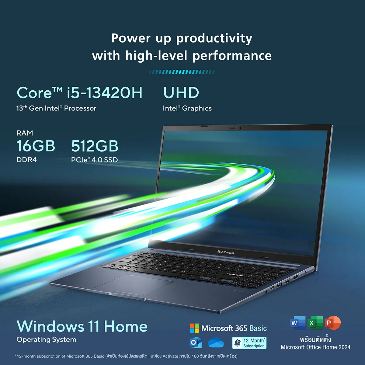 6. มาพร้อม Windows 11 Home , Microsoft Office Home 2024 และ 12-month subscription of Microsoft 365 Basic (จำเป็นต้องใช้บัตรเครดิต และต้อง Activate ภายใน 180 วันหลังจากเปิดเครื่อง)