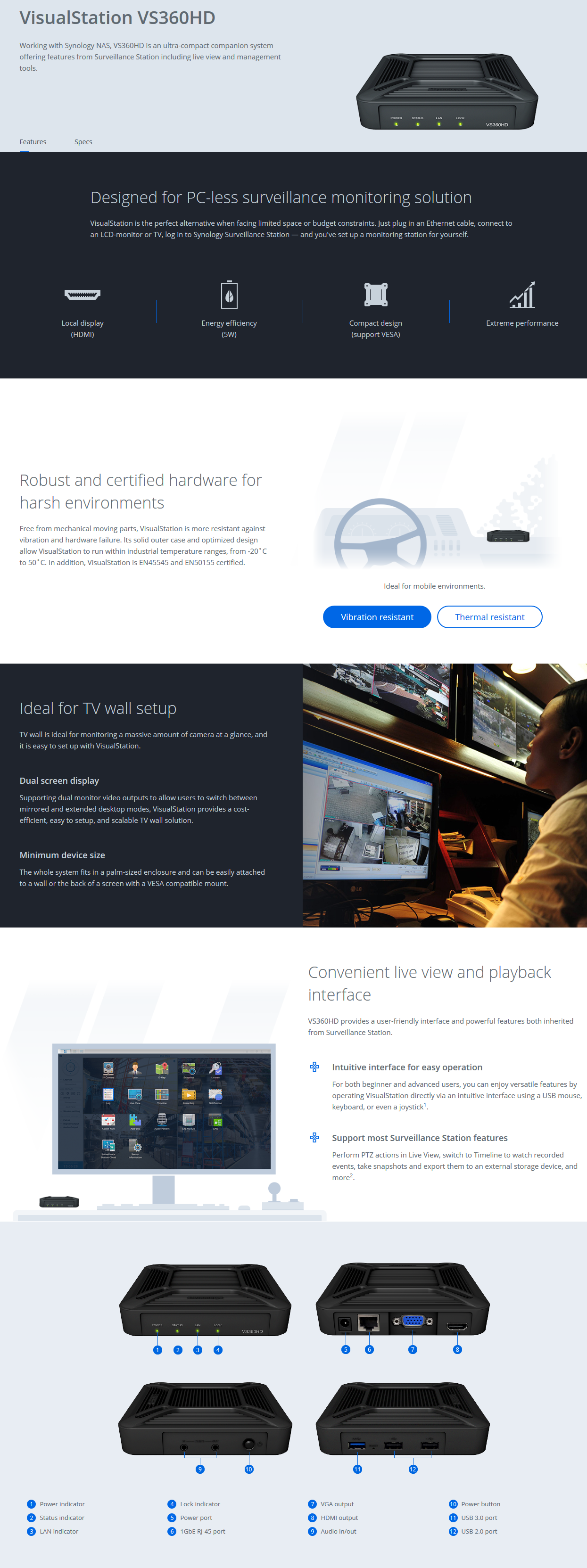 เพิ่มความสะดวกคล่องตัวในการบริหารจัดการกล้องIP Cameraจำนวนมากในปัจจุบันได้เต็มประสิทธิภาพกับ Synology VS360HD โดยเป็นNVR ที่ทำงานเป็นแบบ VisualStation สนับสนุน Video Decoderและเชื่อมต่อจอมอนิเตอร์ หรือ LCD TVได้ทันทีโดยไม่ต้องทำงานผ่านทางเครื่องคอมพิวเตอร์รองรับการแสดงภาพที่คมชัดสูงสุดระดับ Full HDทั้งระบบดิจิทัลผ่านพอร์ต HDMIหรือใช้งานกับอุปกรณ์รุ่นเก่าระบบแอนาลอคผ่านพอร์ต D-subก็ได้เช่นกัน
