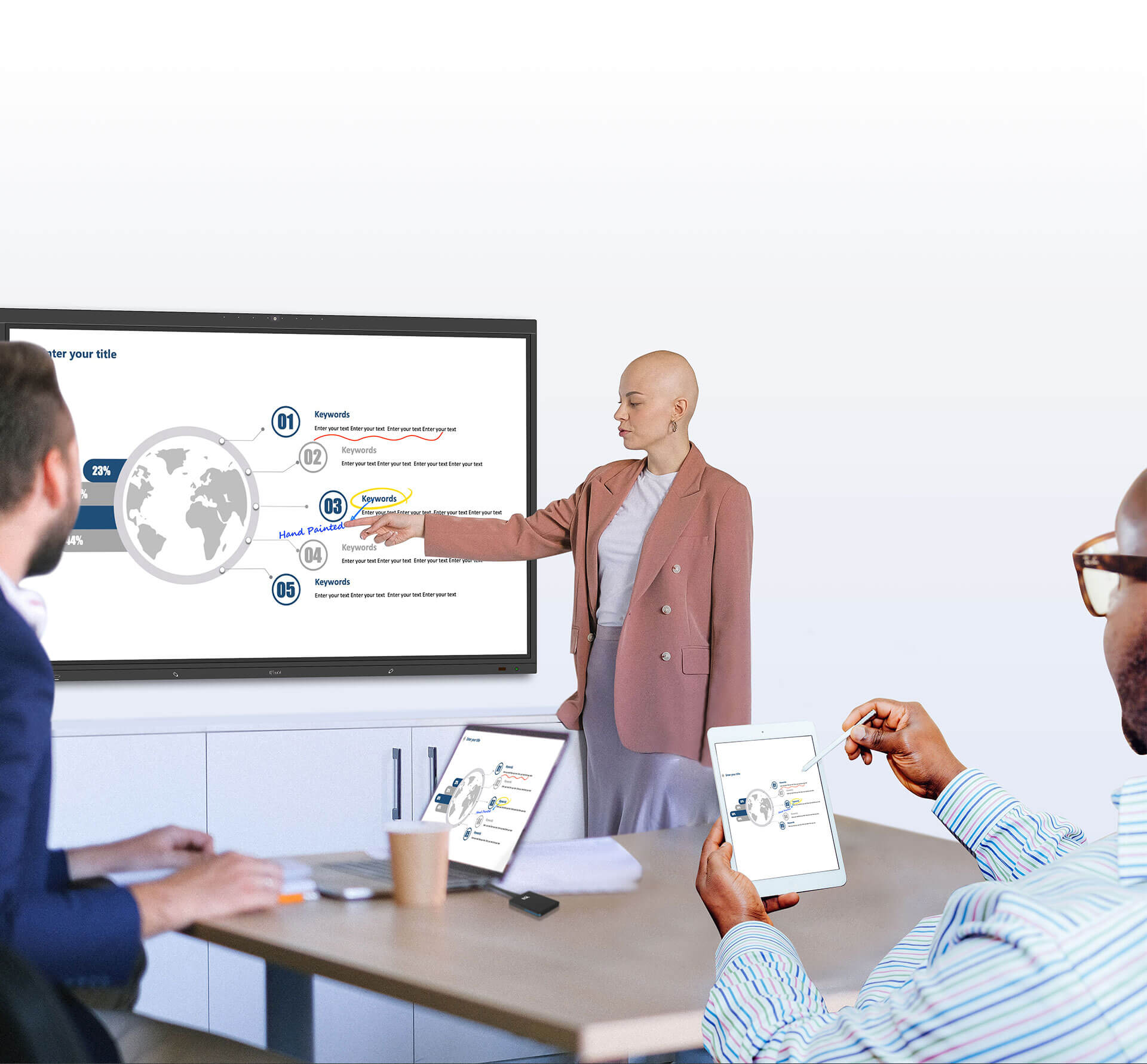นิยามวิธีของคุณเองในการเริ่มประชุมครั้งใหม่ ซึ่งสถานที่ทำงานในปัจจุบันนี้ มีผู้คนจำนวนมากที่มักจะนำอุปกรณ์ของตนเองมาใช้ในสำนักงาน IQSHARE ช่วยให้คุณสามารถเชื่อมต่อไร้สายกับหน้าจอห้องประชุมด้วยอุปกรณ์ของคุณเอง และเริ่มการประชุมทางวิดีโอโดยใช้แพลตฟอร์มที่คุณต้องการ (Microsoft Teams, Zoom, Webex)
