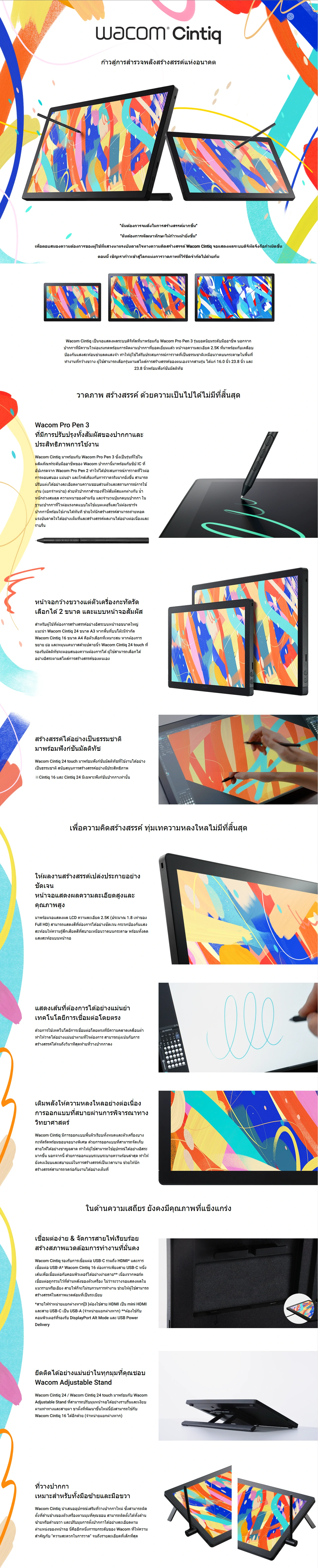 • Wacom Cintiq เป็นจอแสดงผลระบบดิจิทัลที่มาพร้อมกับ Wacom Pro Pen 3 รุ่นยอดนิยมระดับมืออาชีพ นอกจากปากกาที่มีความไวต่อแรงกดพร้อมการติดตามปากกาที่ยอดเยี่ยมแล้ว หน้าจอความละเอียด 2.5K ที่มาพร้อมกับเคลือบป้องกันแสงสะท้อนช่วยลดแสงจ้า ทำให้ผู้ใช้ได้รับประสบการณ์การวาดที่เป็นธรรมชาติเหมือนวาดบนกระดาษในพื้นที่ทำงานที่กว้างขวาง ผู้ใช้สามารถเลือกรุ่นตามสไตล์การสร้างสรรค์ของตนเองจากสามรุ่น ได้แก่ 16.0 นิ้ว 23.8 นิ้ว และ 23.8 นิ้วพร้อมฟังก์ชันมัลติทัช