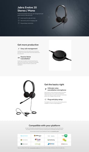 Jabra Evolve 20 headset, warning leaflet, warranty leaflet, quick start guide, USB controller, plastic bag for controller, plastic bag for headset, certified for Skype for Business sticker (refer to BOM), foam bag for the left earcup of the stereo headset only