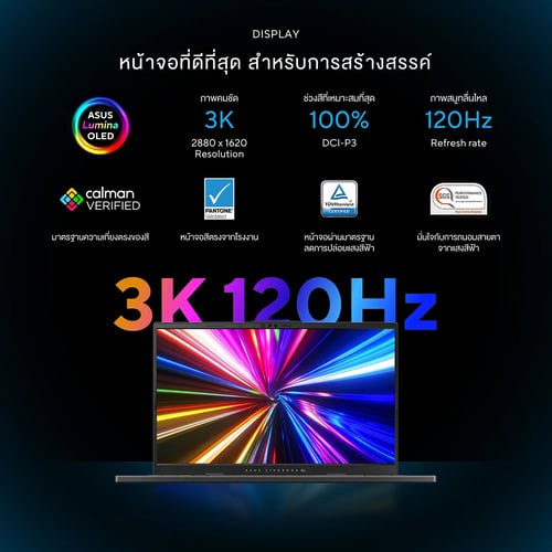 2. หน้าจอดีที่สุดเพื่อการสร้างสรรค์ ความละเอียด 3K OLED สัดส่วน 16:9 ภาพคมชัด สีสันสดใส แสดงผลสีตรง แม่นยำ ในช่วงสีมาตรฐาน DCI-P3 100% พร้อมถนอมสายตาจากแสงสีฟ้า