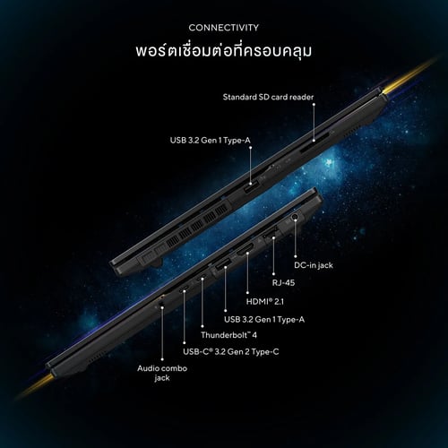 2 x USB 3.2 รุ่น 1 Type-C รองรับการแสดงผล/การป้อนไฟ 2 x USB 3.2 รุ่น 1 Type-A 1x Thunderbolt™ 4 supports display / power delivery 1x HDMI 2.1 TMDS 1x 3.5mm Combo Audio Jack 1 x RJ45 Gigabit Ethernet 1x DC-in เครื่องอ่านการ์ด SD 4.0