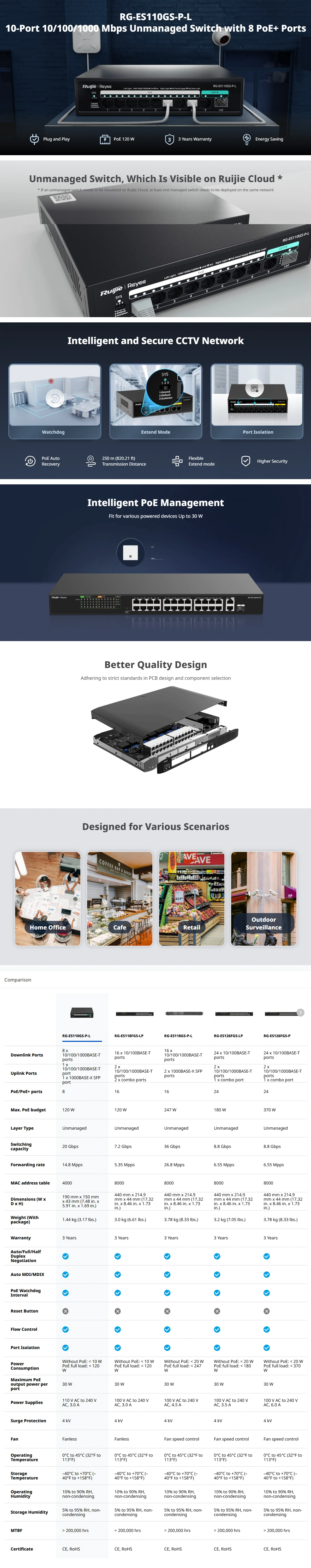 • สวิตช์ที่ใช้ PoE ที่ไม่มีการจัดการโดยมีพอร์ตความเร็ว 10/100/1000 Mbps จำนวน 10 พอร์ต