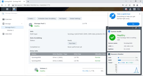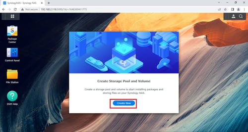 16. หลังจากดำเนินการติดตั้ง DSM เรียบร้อยแล้ว ขั้นตอนต่อไปเริ่มทำการสร้าง Storage Pool และ Volume โดยกดปุ่ม Create Now
