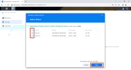 19. ตามตัวอย่างเป็นการทำ Hybird RAID (SHR) ใช้ Harddrive จำนวน 2 ตัว จากนั้นกดปุ่ม Next
