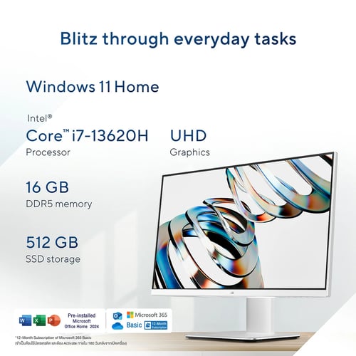 7. มาพร้อม Windows 11 Home , Microsoft Office Home 2024 และ 12-month subscription of Microsoft 365 Basic (จำเป็นต้องใช้บัตรเครดิต และต้อง Activate ภายใน 180 วันหลังจากเปิดเครื่อง)