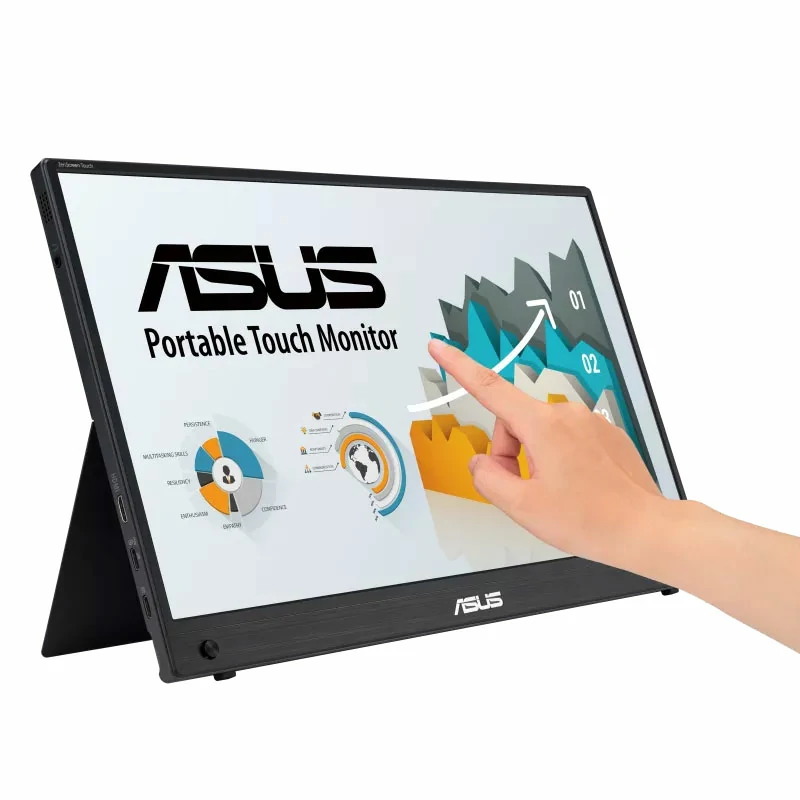 ASUS ZenScreen Touch MB16AMTR portable monitor — 16 inch (15.6 inch viewable), FHD (1920 x 1080), IPS, 10-point touch, Built-in Battery, Hybrid Signal Solution, Mini-HDMI, ergo kickstand, tripod socket, ASUS Flicker Free and Low Blue Light technologies, Compatible with Laptops, Smartphones and Game Consoles
